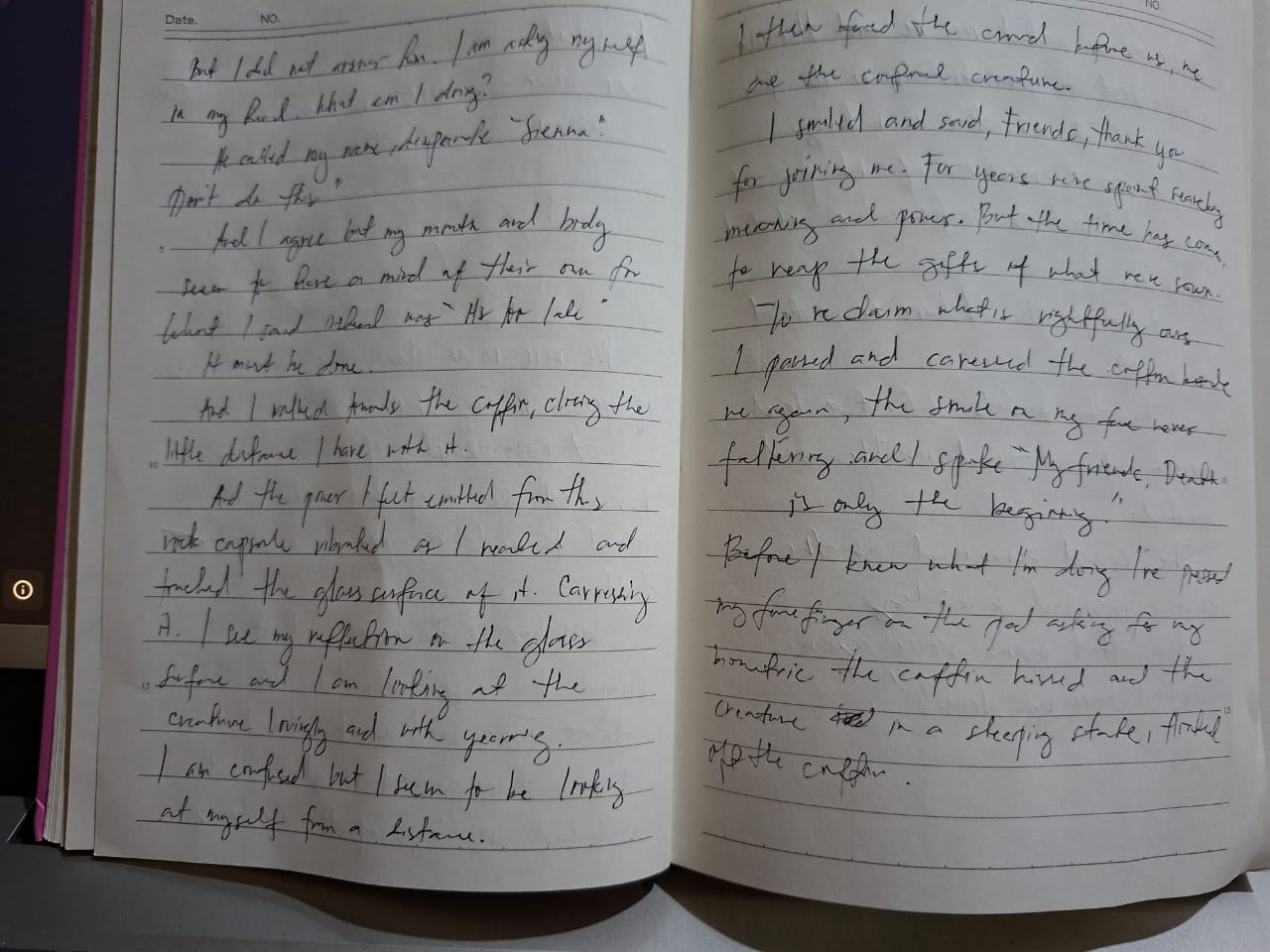 What does that mean? I ask myself…but no questions came; no memory came flashing to provide insights as to what is to unfold tonight. My feet walked towards the coffin until I was hovering over it. And I saw my own face reflected in it. I am looking at this thing lovingly, my eyes filled with yearning.